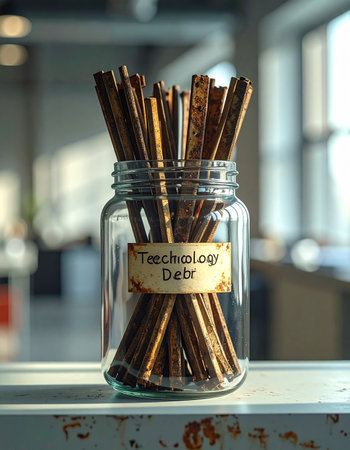 A glass jar on a desk visually represents the concept of 'technology debt'.