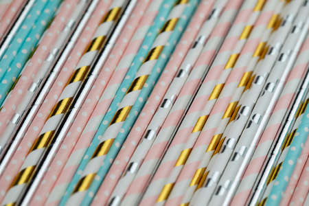 Gold and white paper straws in the golden glass. Christmas concept. Festive holiday party background. Horizontal, banner format