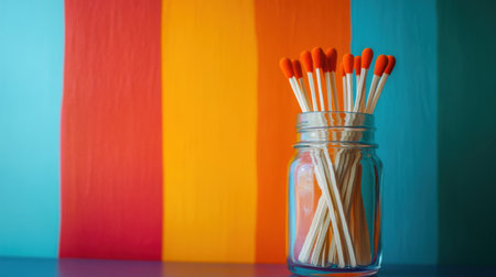 A glass jar filled with vibrant matchsticks stands against a colorful striped background. This still life arrangement adds a modern touch to any decor.