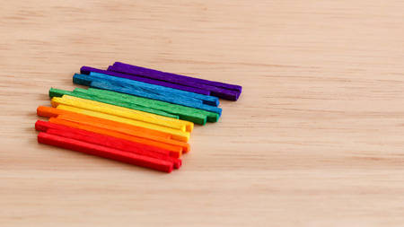Wooden rainbow color sticks on the wood background.