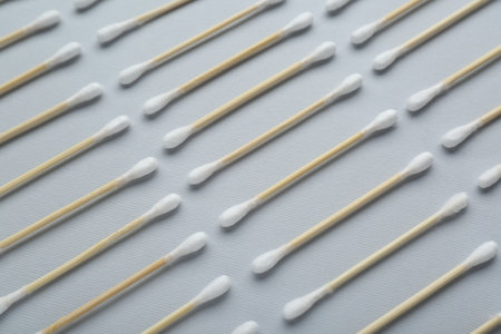 Many wooden cotton buds on light gray background, flat lay