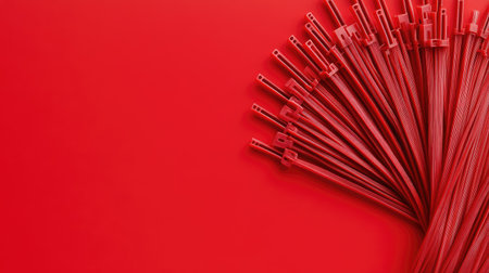 Nylon cable ties fanned out like spokes on a wheel on a solid red background, creating a simple yet dynamic industrial design
