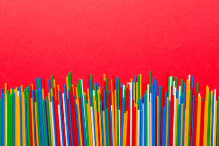 Heap of colorful plastic drinking straws on Colored background, flat lay. Copy Space for text.