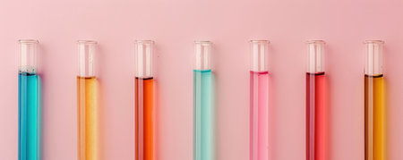 Seven colorful glass tubes on a pink background.