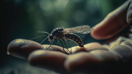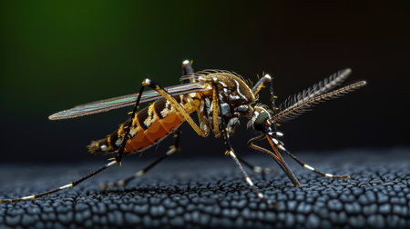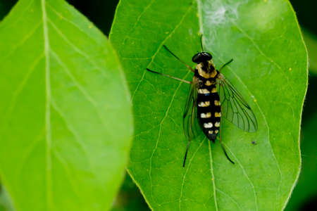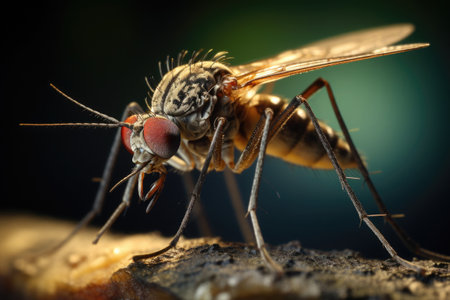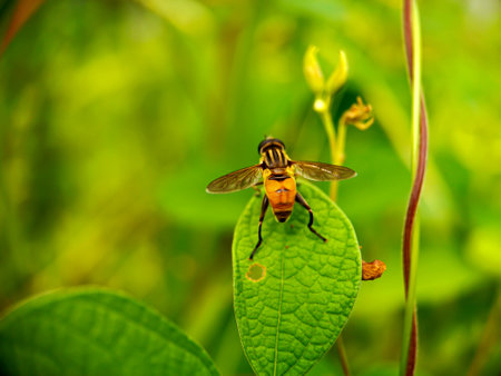 A close-up of a yellow and black fly with its long legs, holding food in one wing while standing on green moss against a blurred background. The focus is sharp to capture the details of the fly's features and its interaction. This scene showcases a natural wildlife photography style, highlighting small yet intricate elements like the eyes or wings of the flying insect. --ar 53:30 --v 6.1 Job ID: 30965f64-3f4a-4d4b-bcb1-1b7b5eeec682