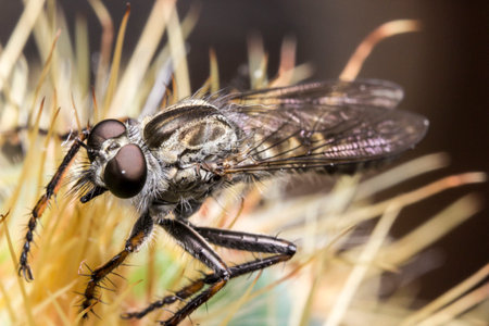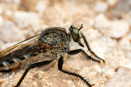 Robber fly Isolated on white background - Proctacanthus brevipennis - species in Florida. Extremely detailed macro closeup showing hairs and bristles on legs and face. front face view
