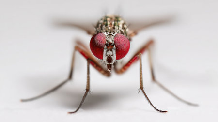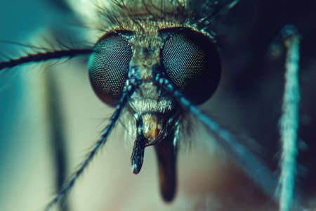Extreme macro of a fly head, showcasing the texture of its eyes and antennae against a minimalist background.