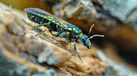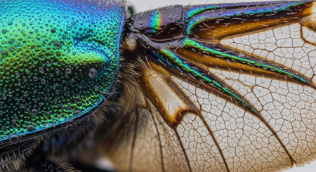 This stunning close-up macro photograph reveals intricate details of an insect, showcasing vibrant colors and textures in its natural habitat.