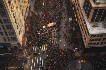 People walking at city street, aerial view. Protesting crowd. Generative AI
