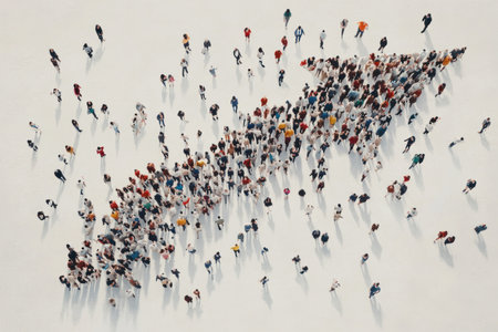 A stunning aerial view of a diverse crowd surrounding a single figure, showcasing unity, individuality, and vibrant colors in a modern artistic design.