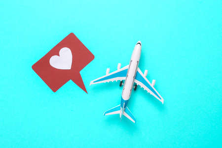 Air plane and like notification icons on blue background. travel concept. Rating, followers feedback. top view