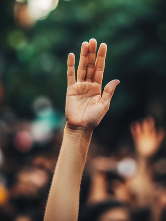 A raised hand makes a powerful gesture in front of a blurred crowd, symbolizing solidarity and unity during an outdoor gathering or demonstration.