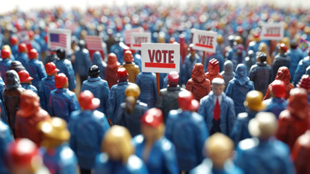 Miniature colorful figures with VOTE signs in a crowd. Tiny individuals in a crowd holding voting placards. Concept of elections, civic duty, collective action, and the power of the vote.