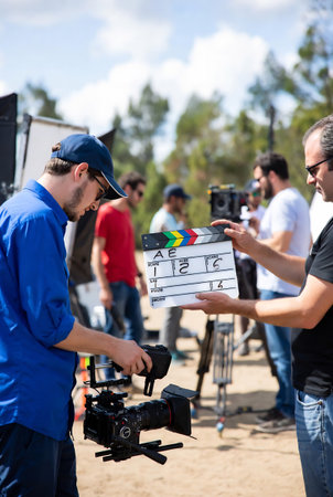 Cameraman and cameraman with movie clapper at outdoor cinema