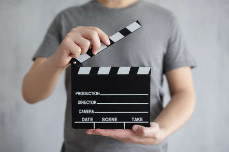 Portrait of man holding clapperboard to cut scenes in movie making industry. Casual person showing board to camera and smiling while having filmmaker object for cinematography