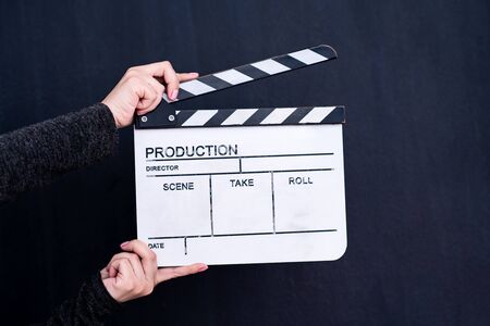 video production movie clapper cinema action and cut concept on black chalkboard background