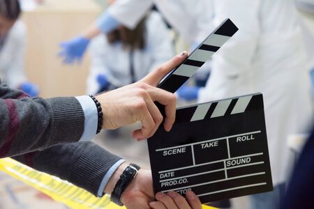 Movie clapper, starting record Forensic investigation on murder crime scene. Criminological expert collecting evidence at the crime scene. Law and police concept.