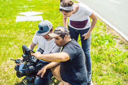 Film crew working together on the set. Organization of outdoor shooting. Director giving directions.