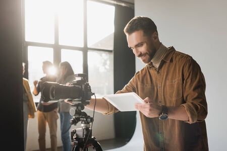 Young bearded cameraman and his assistant with documents consulting about shooting while standing in front of camera in studio