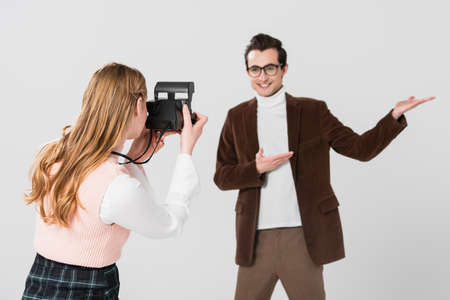 smiling man pointing with hands near woman with vintage camera isolated on gray, blurred background