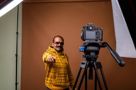 Portrait of Indian man with mustache wearing sunglasses while vlogging