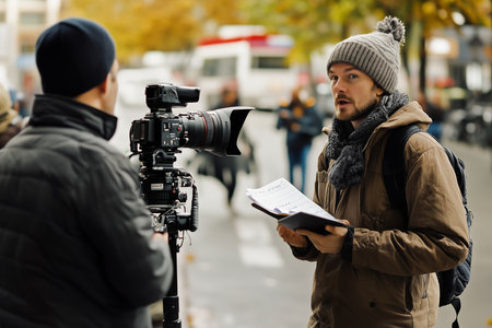 A male journalist conducts an interview on a bustling city street, surrounded by cameras and filming equipment. Generative AI