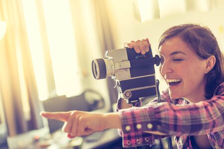Happy photographer calculating frame with her hand holding mirrorless camera