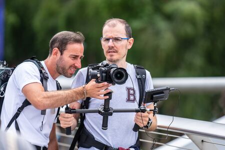 Steadicam operator and his assistant prepare camera and 3-axis stabilizer-gimbal for a commercial shoot