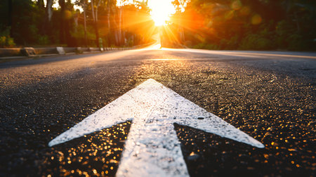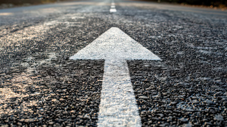 Close-up captures a white arrow marked on a weathered asphalt road, symbolizing forward movement. The arrow's texture contrasts with the pavement, emphasizing direction.