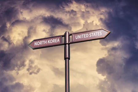 Road sign with the inscription North Korea, United States against the backdrop of a stormy sky.