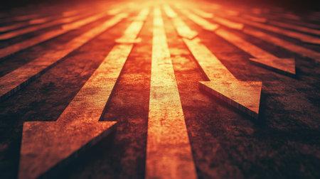 A captivating image featuring bright orange glowing arrows on a dark surface. This artwork symbolizes movement, direction, and technological energy, perfect for modern themes.