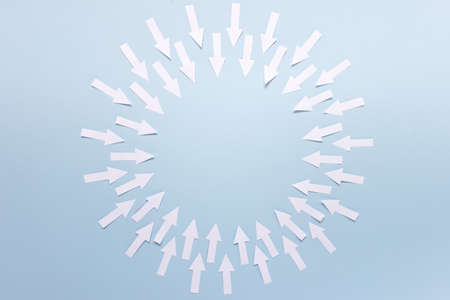 Circle made of many arrows pointing inwards on blue background. Photo with copy blank space.