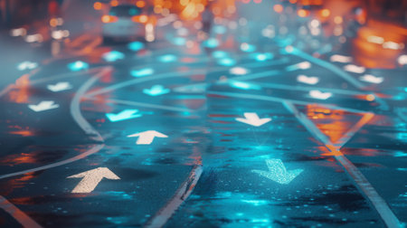 Complex, illuminated network of arrows on a road decision making and complexity in navigation. AI generated