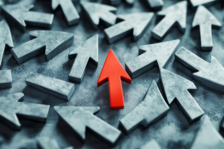 A striking red arrow stands out among numerous gray arrows, emphasizing individual achievement and growth in a minimalist environment, symbolizing ambition and direction.