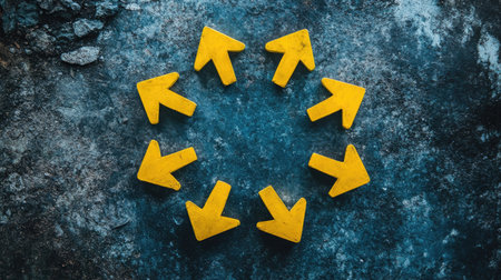 A vibrant arrangement of yellow arrows on a dark textured backdrop. The circular pattern creates a striking visual representation of direction and movement, perfect for artistic uses.