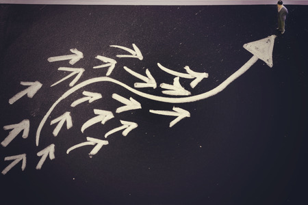 White chalk drawing of various arrows on black grunge background with copy space