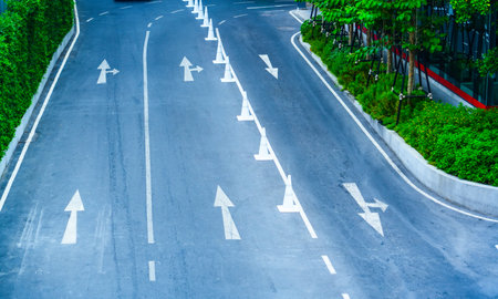 Arrow made on road by painting for directional movement on street , one way traffic concept