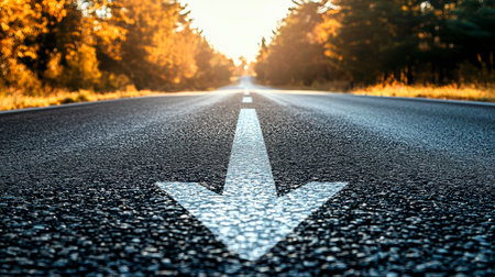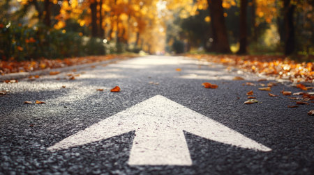 A close-up view of a white arrow painted on an asphalt road, symbolizing direction and guidance. The image captures a serene outdoor setting, inviting exploration.