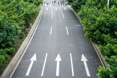 White road arrow on dark asphalt. low angle of white arrow on asphalt road showing goal