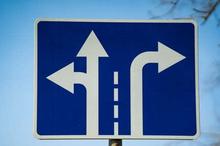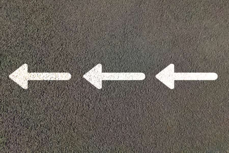 White and yellow arrows on asphalt showing different directions. Painted arrows on road symbolizing choice and direction. Top view.