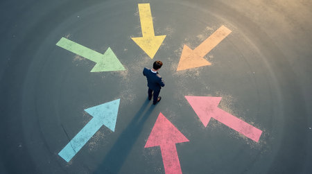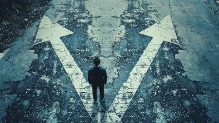 A person in formal attire stands at a marked intersection with vibrant arrows pointing in different directions under clear blue skies. The surroundings suggest a moment of decision-making.