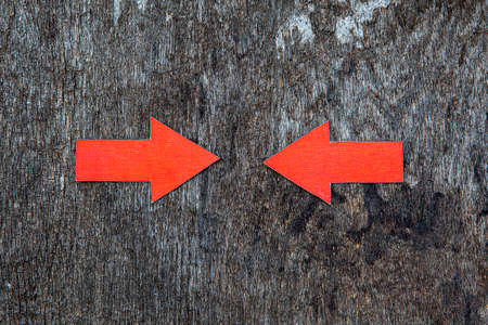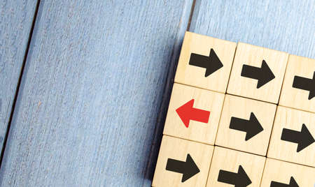 Red arrow print screen on wooden block change direction from right to left which differ from black arrows, Business and technology disruption concept.