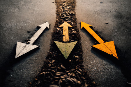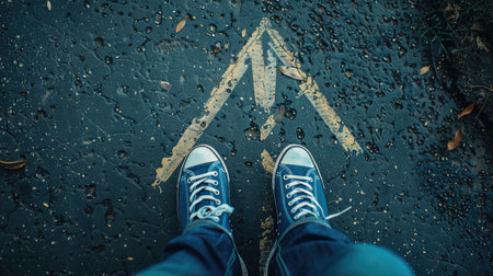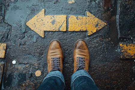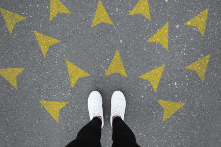 Arrows pointing in different directions, a person standing on the ground wearing shoes, looking down at the arrows pointing towards them. --ar 3:2 --stylize 750 --v 6.1 Job ID: b25a5bde-e90f-4ede-9cc4-eebd77ff79d2
