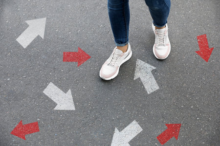 Woman walking on asphalt road with red and white arrows pointing in different directions, closeup. Concepts of choice, decision, alternative way