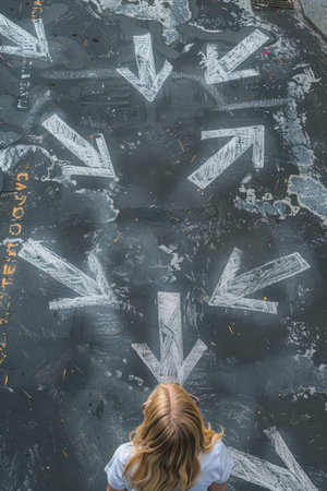 A girl and a lot of arrows on the road. The girl will choose the way by the arrows.