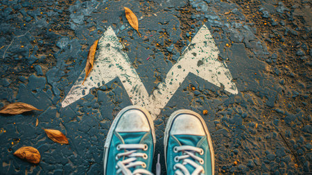 Youth street lifestyle. Male sneakers on asphalt road with drawn direction arrow as millennial education guidance, student guide, consultation and advisory, top view.