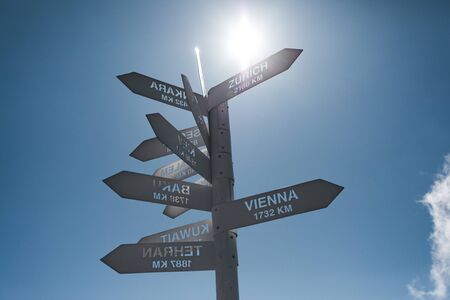 White metal signpost with names of capital cities at summit of Tahtali mountain. Kemer, Turkey