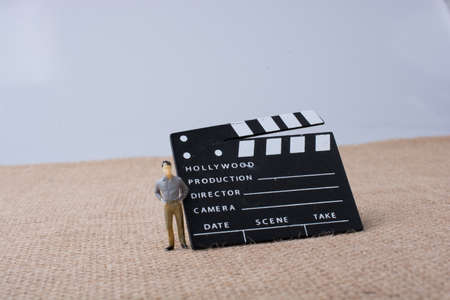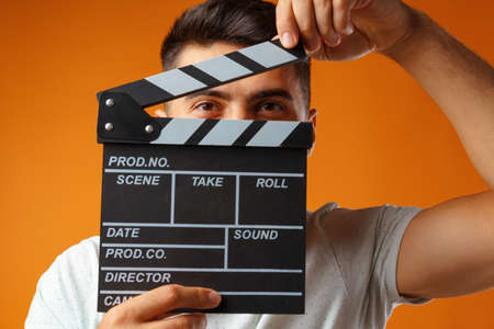 Actor casting. Shooting scene. Favorite series. Cinema production. Creative producer. Bearded man hold movie clapper. Film maker. Clapperboard copy space. Comedy or drama. Watch movie. Film director