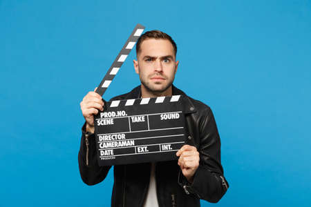 Handsome stylish young unshaven man in black jacket white t-shirt hold in hand film making clapperboard isolated on blue wall background studio portrait. People lifestyle concept. Mock up copy space