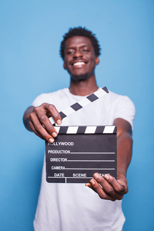 Portrait of black man using a clapperboard to trim sequences in the film business. Young male adult laughing and displaying whiteboard to camera while holding filmmaker object for filming.